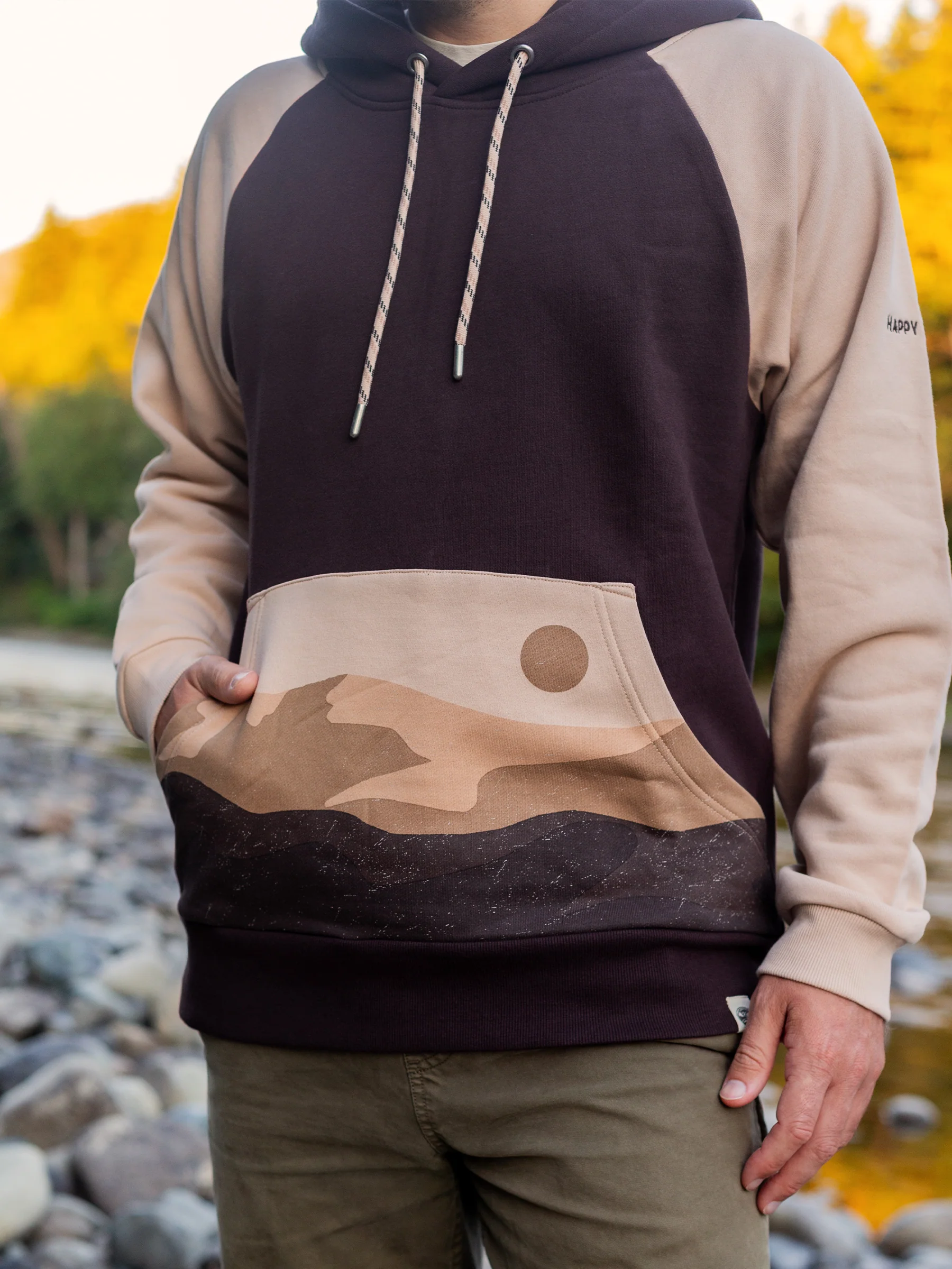 Relaxed hoodie with oversized hood (fits over headphones!) and large, decorative front pocket. Made Fair Trade from premium organic cotton. This two-toned hoodie in Driftwood tan and Espresso brown is embroidered on the left shoulder and printed seam-to-seam on the kangaroo pocket with non-toxic, water-based inks.